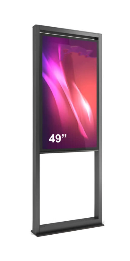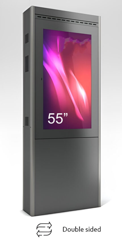Poziționat pentru vizibilitate la înălțime medie, această versiune suportă un ecran Samsung OH de 55″ în orientare verticală sau orizontală. Designul său modular permite upgrade-uri viitoare la configurații cu ecran dublu sau triplu, pe măsură ce nevoile dvs. de semnalizare evoluează. Baza totemului include un compartiment securizat pentru găzduirea playerelor media, cablurilor și unităților de alimentare, menținând instalația curată și protejată.