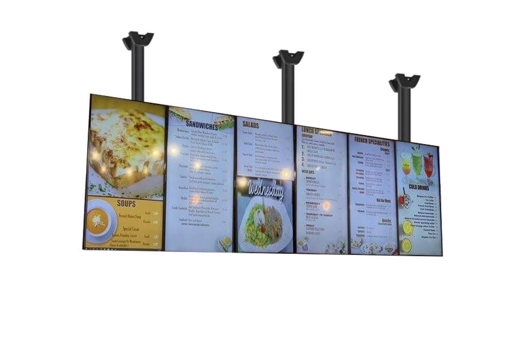 Prima paginăOras SmartTotem - Kiosk - Display InteractivDisplayuri profesionale Meniu Board cu 6 display-uri portret LG 49″ si prindere de tavan Vogel`s